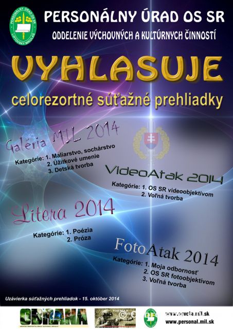 Personálny úrad OS SR cestou oddelenia výchovných a kultúrnych činností vyhlasuje celorezortné súťažné prehliadky (CSP) FotoAtak, Litera, VideoAtak a Galéria MIL.